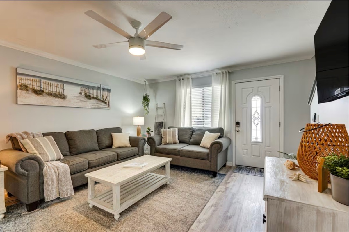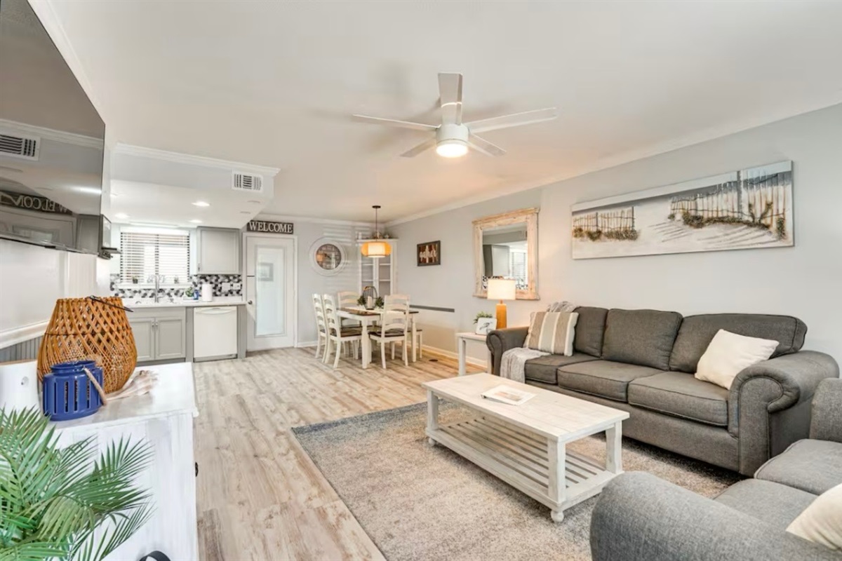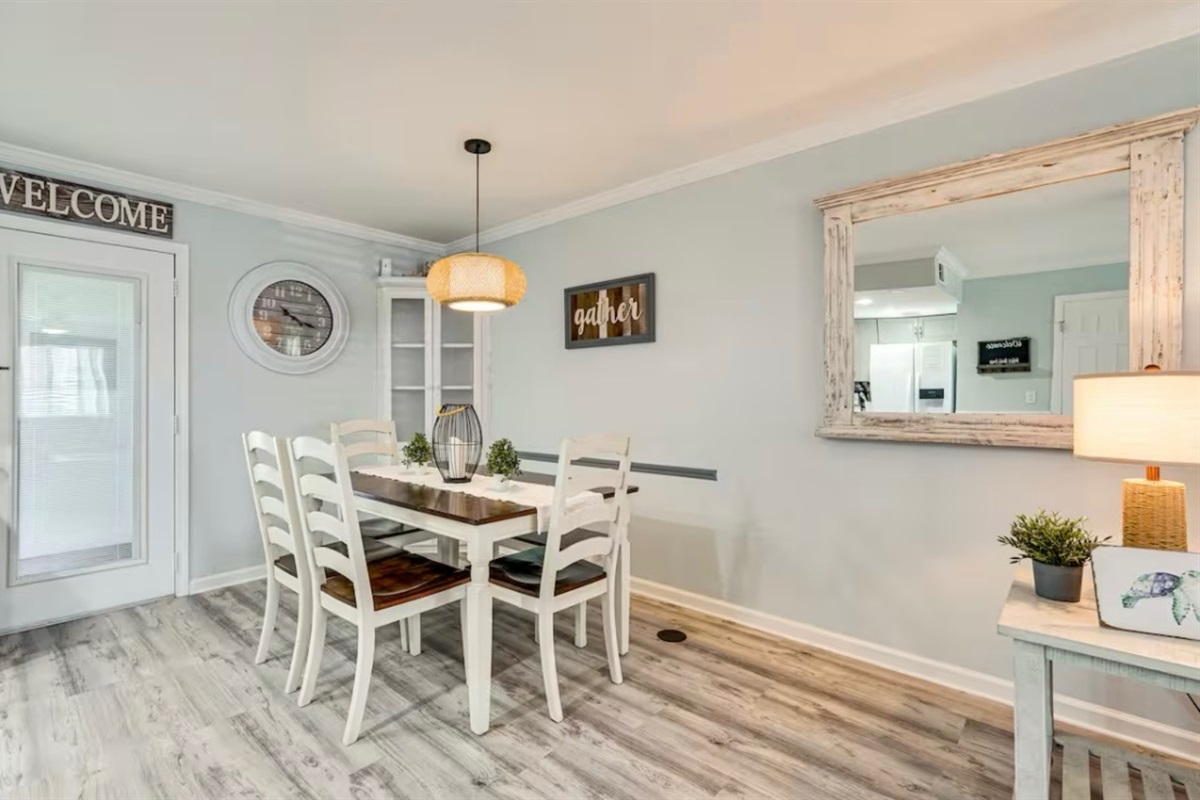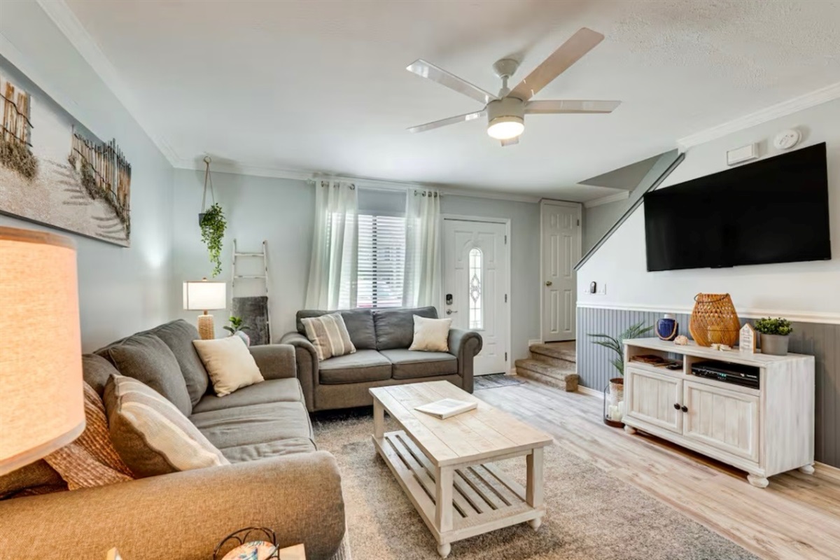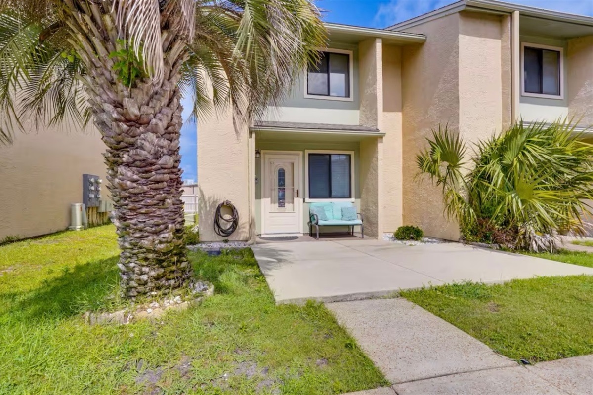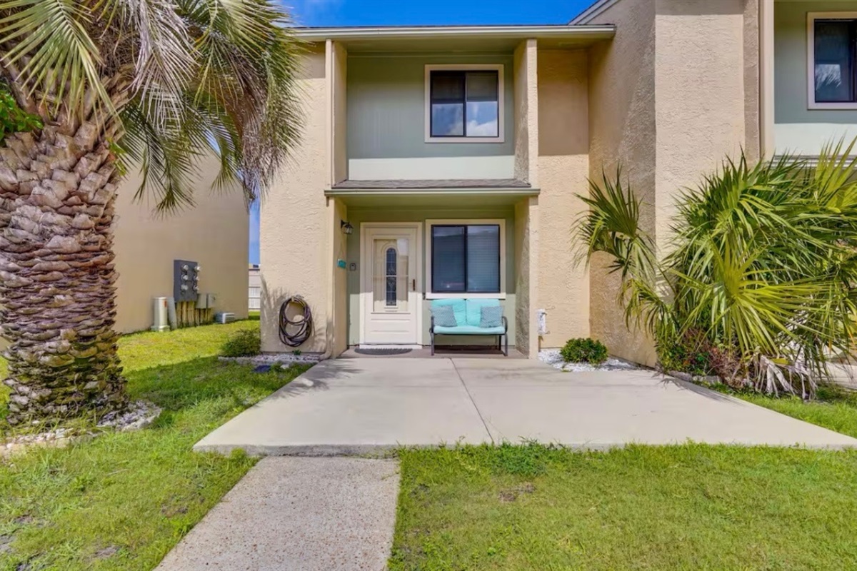 The Sandy Turtle townhome is a ground floor, two story, end-unit townhome that is upgraded, beachy, clean and comfortable. The downstairs offers an open floor plan with a living area that is spacious with a comfy couch and loveseat plus smart TV, and the dining area seats six. The kitchen is well equipped with all appliances needed for meals and snacks including a traditional full pot coffee maker and a single cup maker, cookware, dishware, and utensils. A half bath is located just off the living area, along with a washer and dryer. An enclosed Florida room out back offers storage for your beach gear and a sliding glass door to the private back yard area.