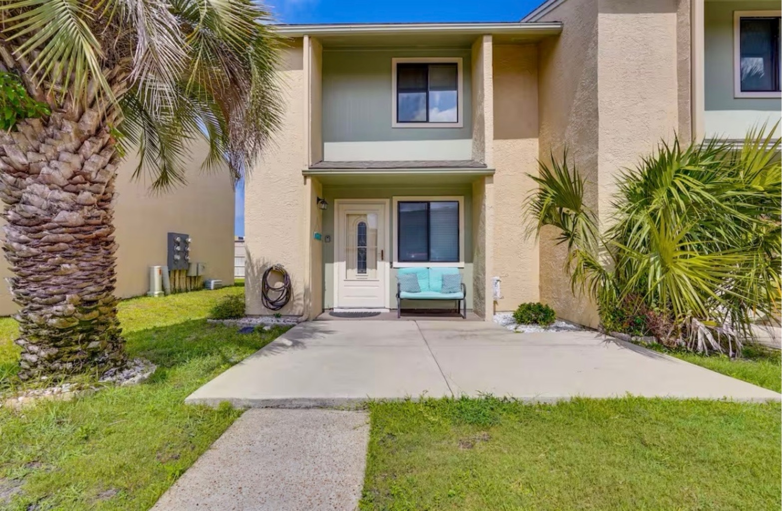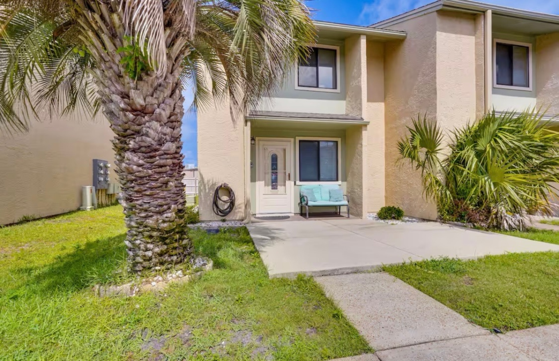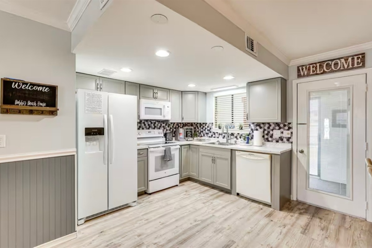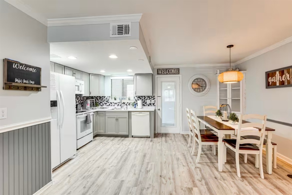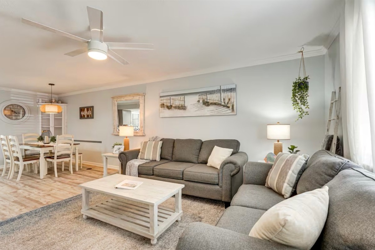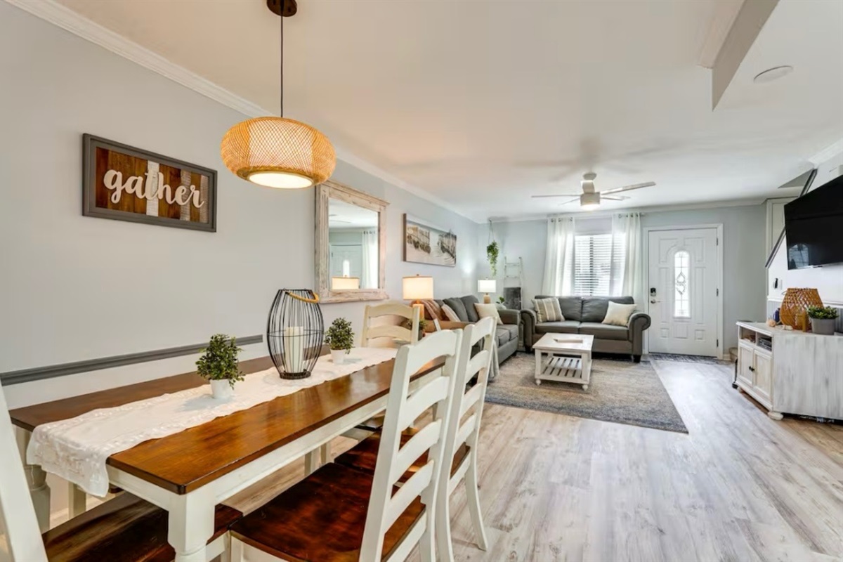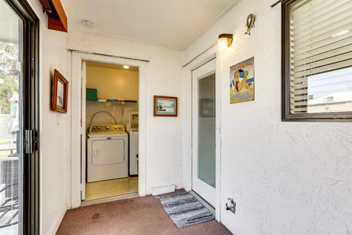The Sandy Turtle townhome is a ground floor, two story, end-unit townhome that is upgraded, beachy, clean and comfortable. The downstairs offers an open floor plan with a living area that is spacious with a comfy couch and loveseat plus smart TV, and the dining area seats six. The kitchen is well equipped with all appliances needed for meals and snacks including a traditional full pot coffee maker and a single cup maker, cookware, dishware, and utensils. A half bath is located just off the living area, along with a washer and dryer. An enclosed Florida room out back offers storage for your beach gear and a sliding glass door to the private back yard area.