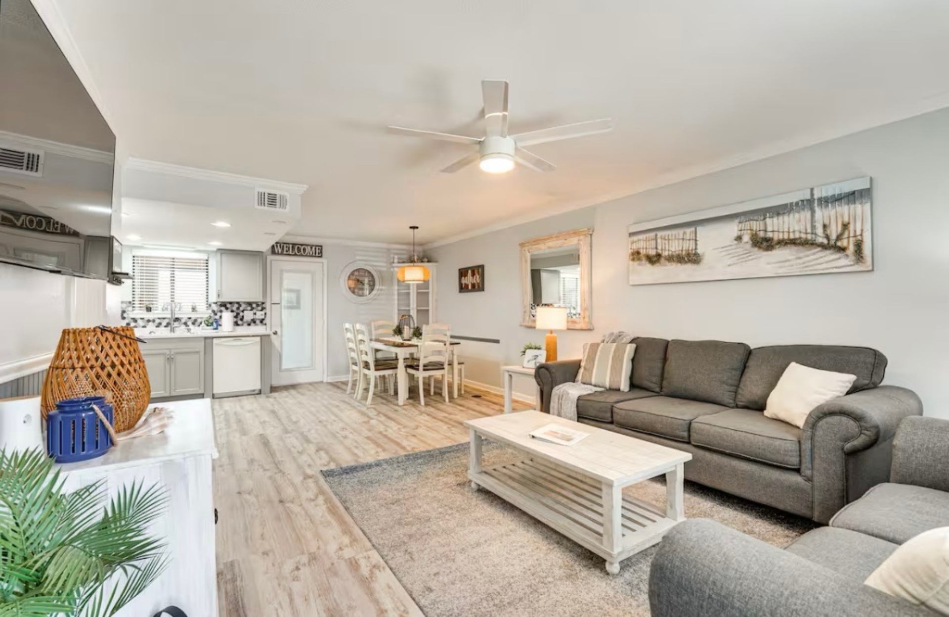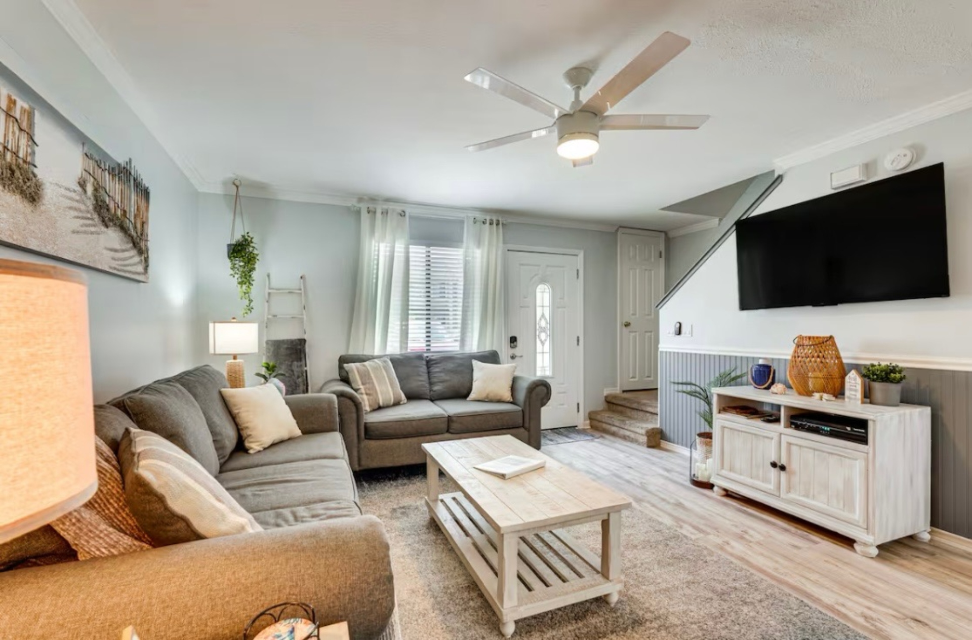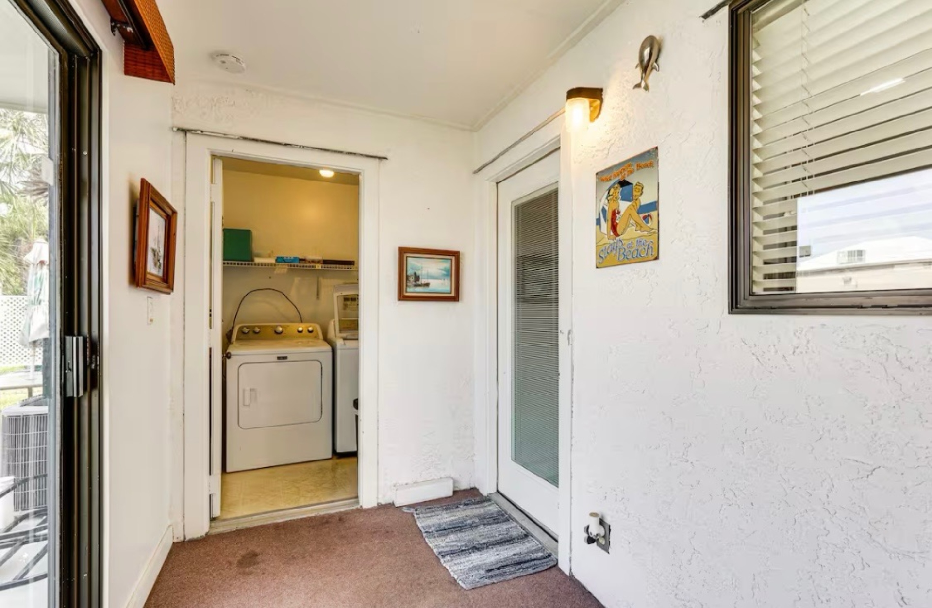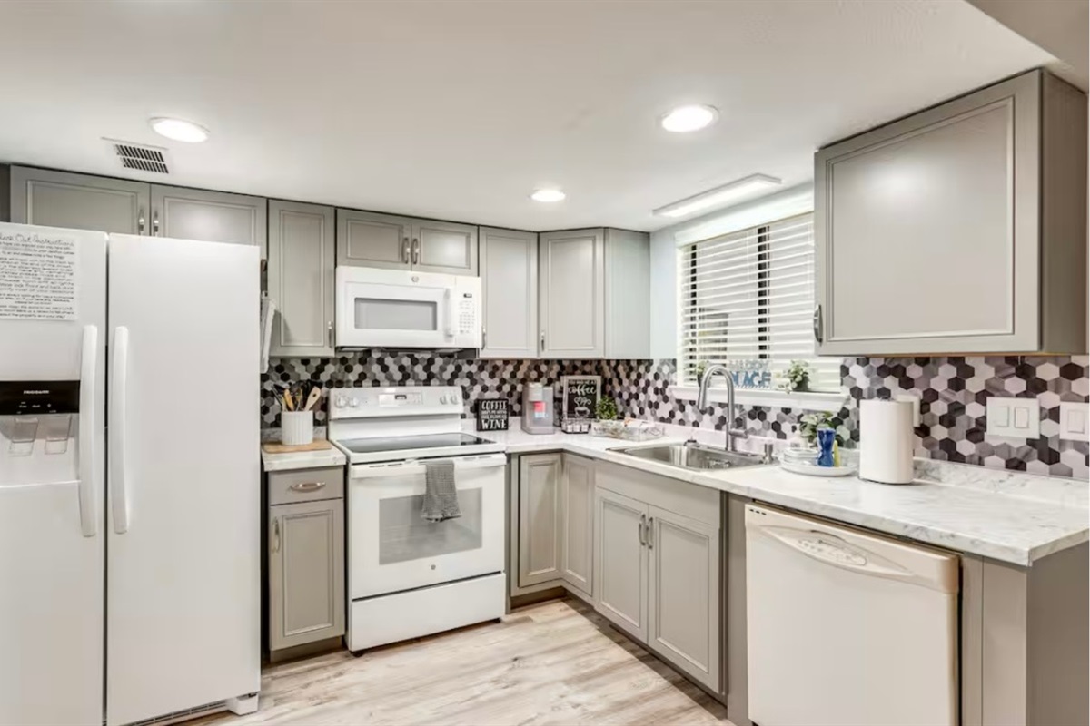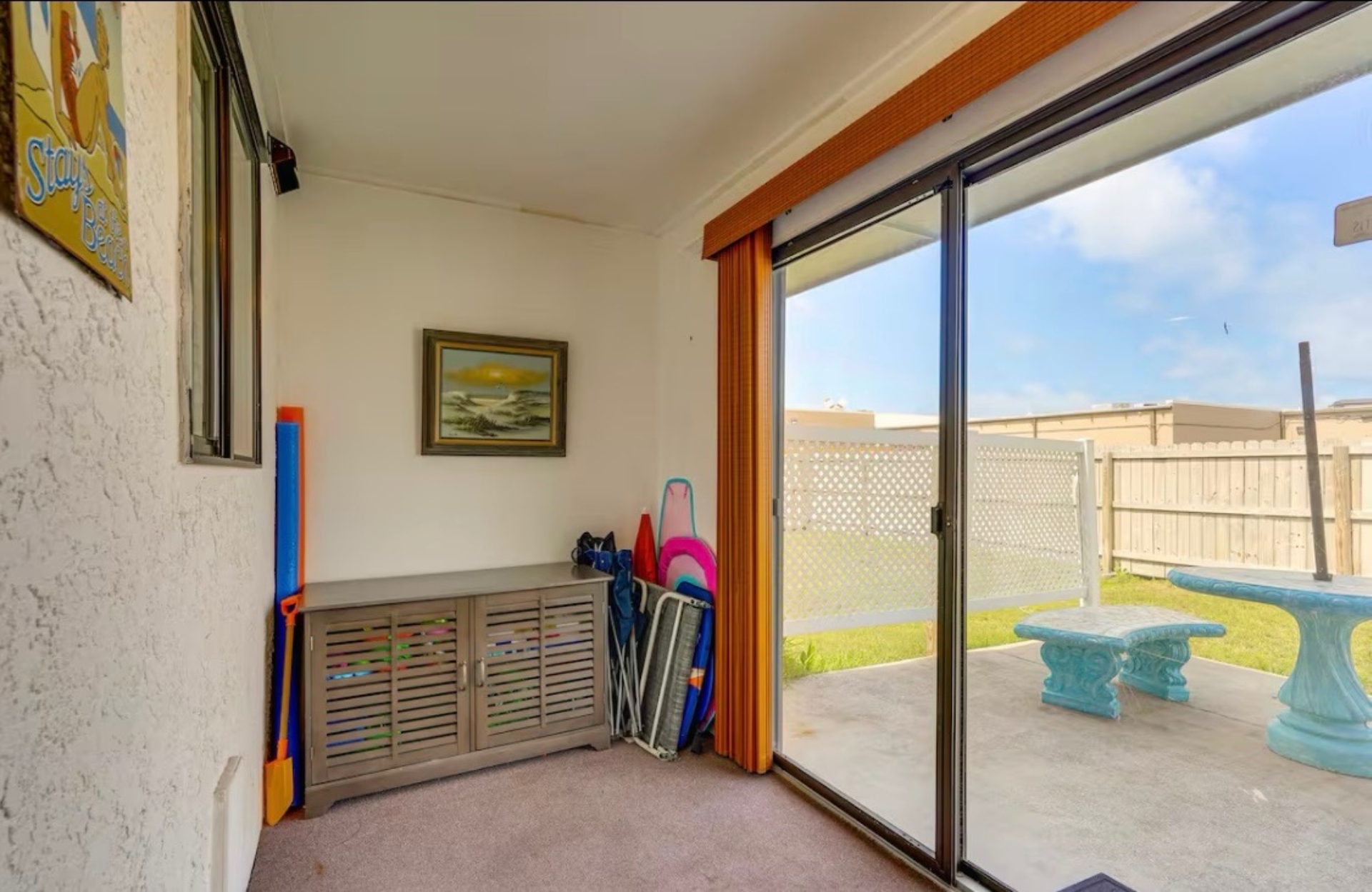 The Sandy Turtle townhome is a ground floor, two story, end-unit townhome that is upgraded, beachy, clean and comfortable. The downstairs offers an open floor plan with a living area that is spacious with a comfy couch and loveseat plus smart TV, and the dining area seats six. The kitchen is well equipped with all appliances needed for meals and snacks including a traditional full pot coffee maker and a single cup maker, cookware, dishware, and utensils. A half bath is located just off the living area, along with a washer and dryer. An enclosed Florida room out back offers storage for your beach gear and a sliding glass door to the private back yard area.