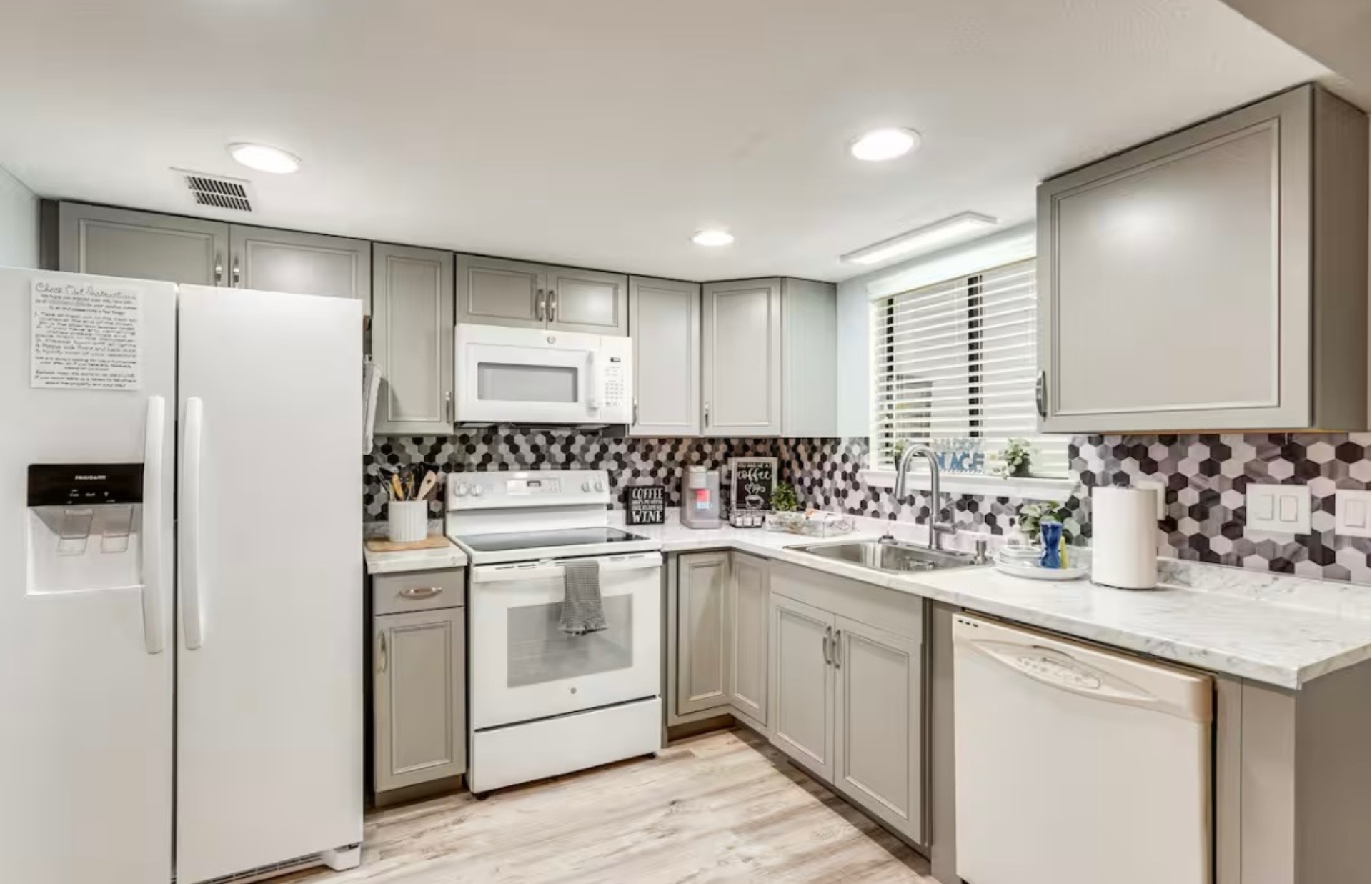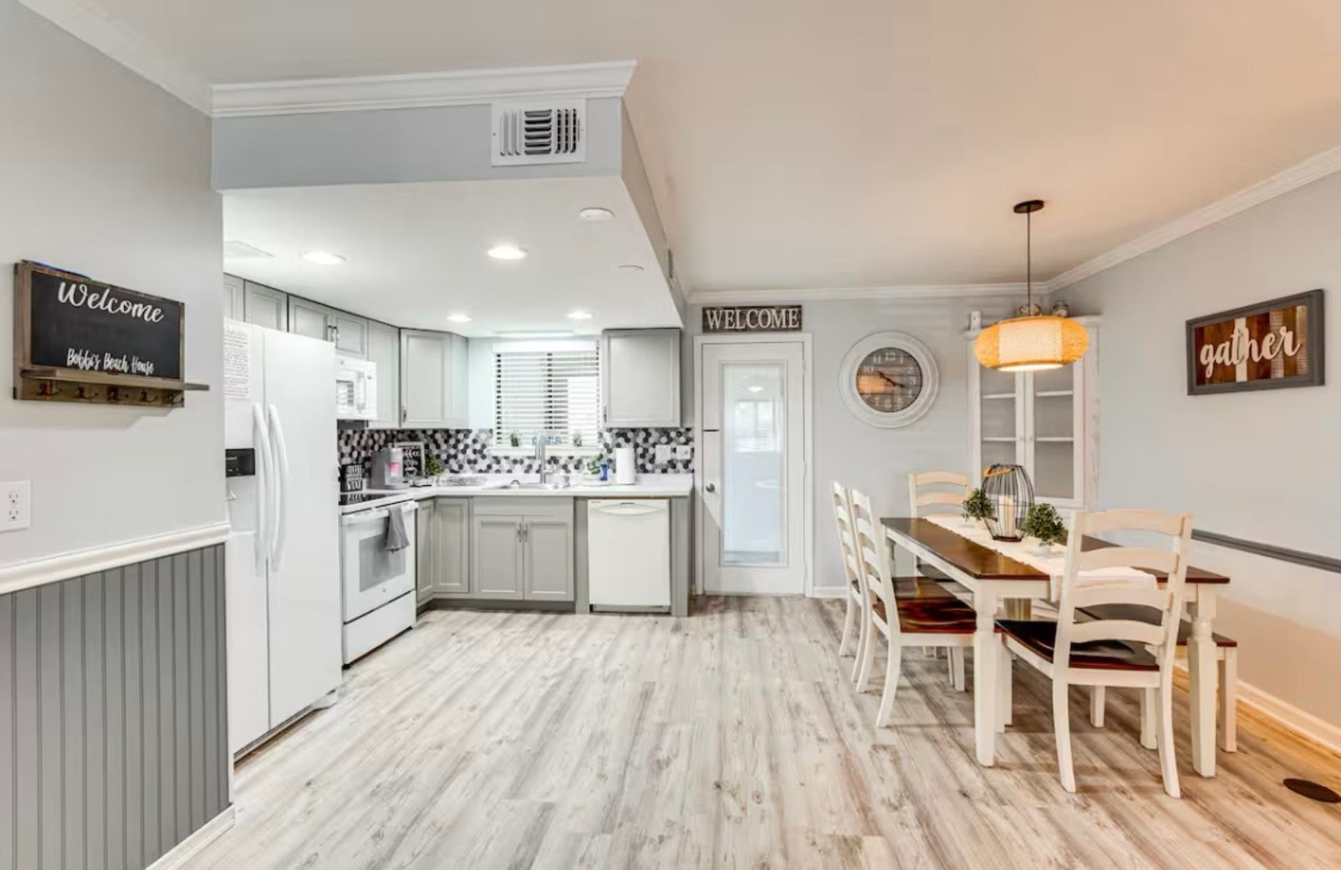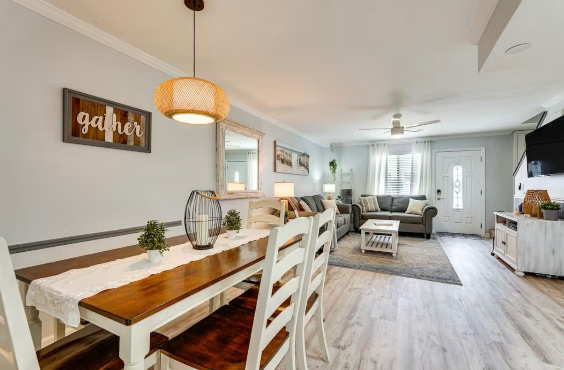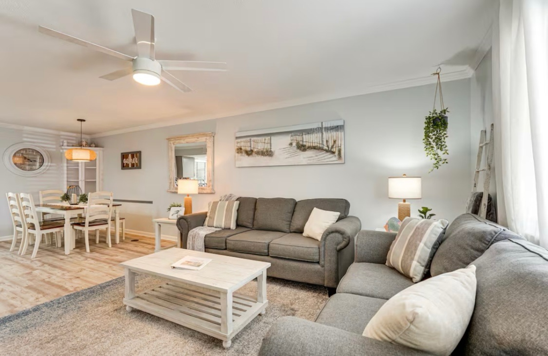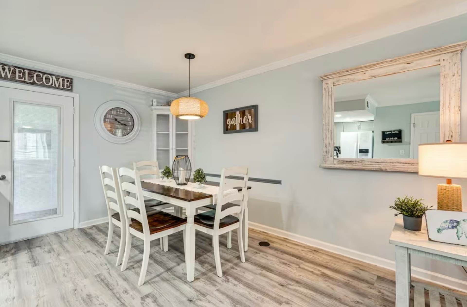 The Sandy Turtle townhome is a ground floor, two story, end-unit townhome that is upgraded, beachy, clean and comfortable. The downstairs offers an open floor plan with a living area that is spacious with a comfy couch and loveseat plus smart TV, and the dining area seats six. The kitchen is well equipped with all appliances needed for meals and snacks including a traditional full pot coffee maker and a single cup maker, cookware, dishware, and utensils. A half bath is located just off the living area, along with a washer and dryer. An enclosed Florida room out back offers storage for your beach gear and a sliding glass door to the private back yard area.