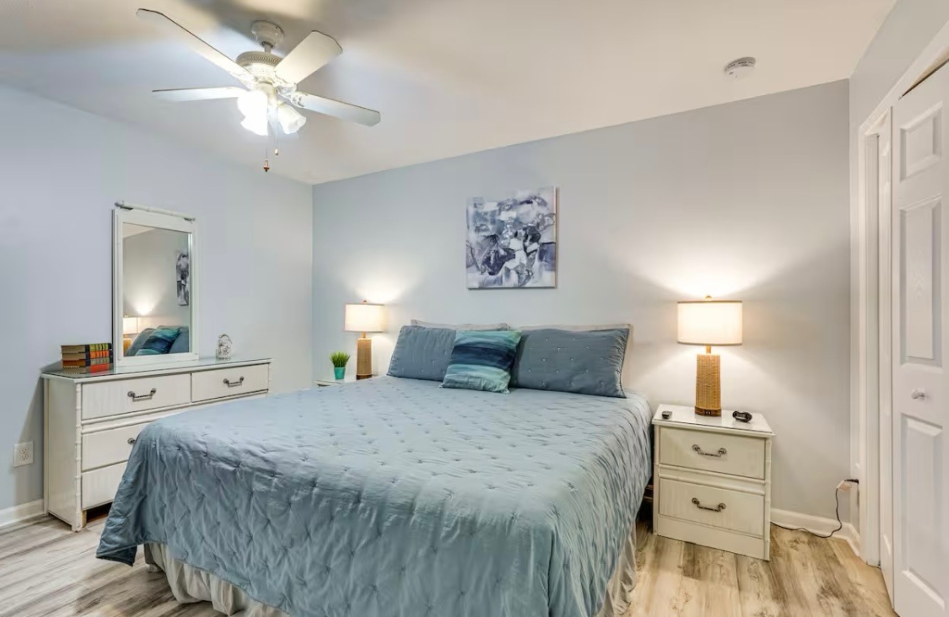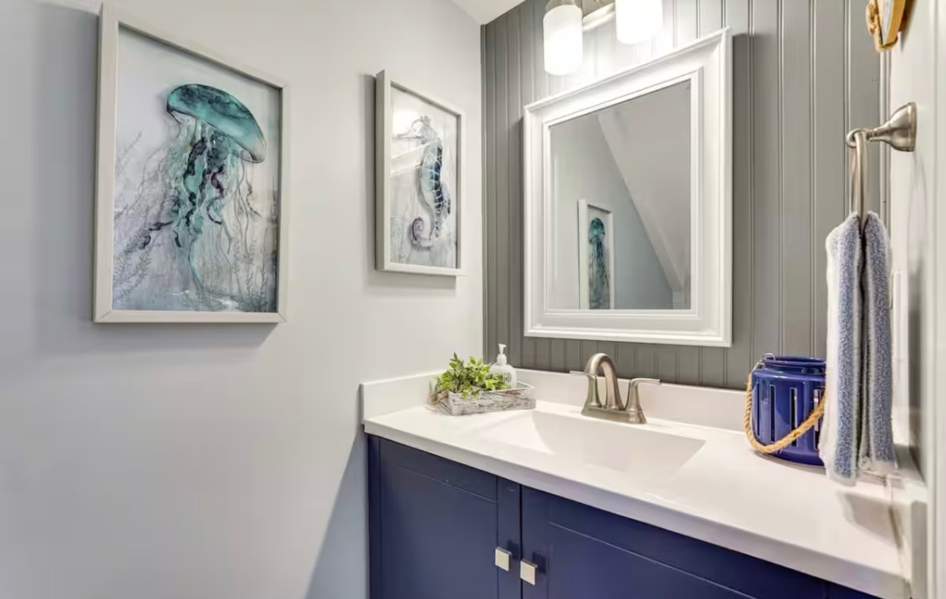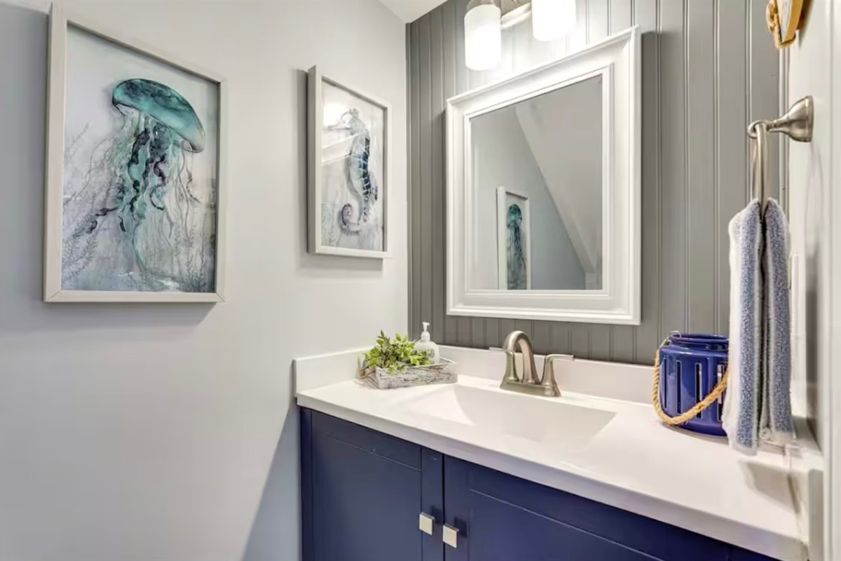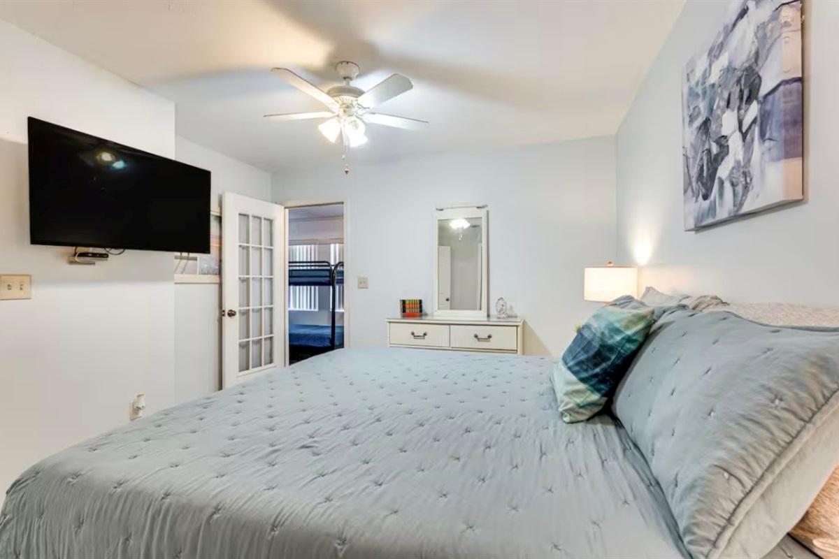 Upstairs, you'll find two bedrooms: both with king beds, smart TVs, and clothing storage. The full bathroom between them has a vanity and tub/shower combo.
