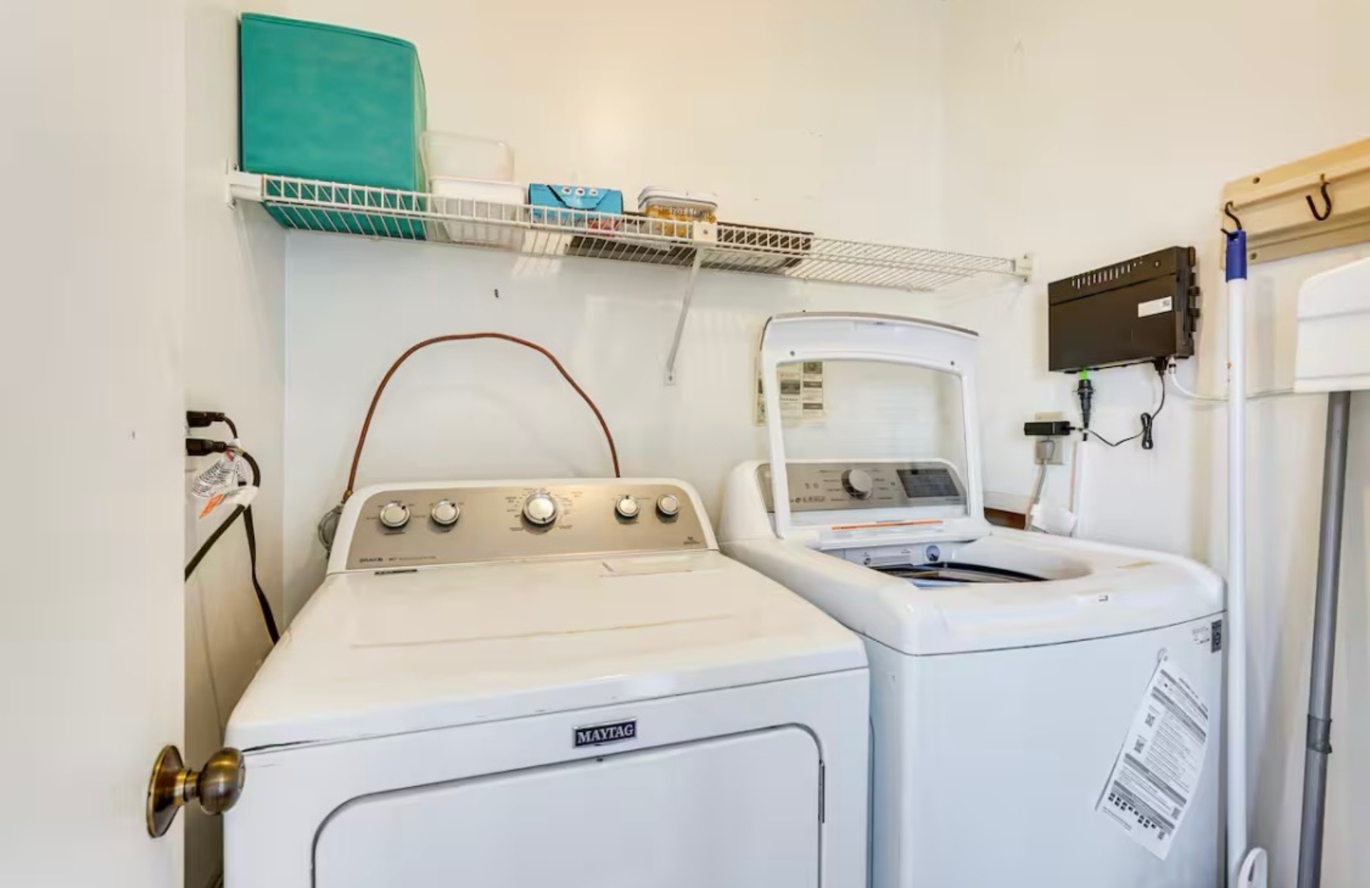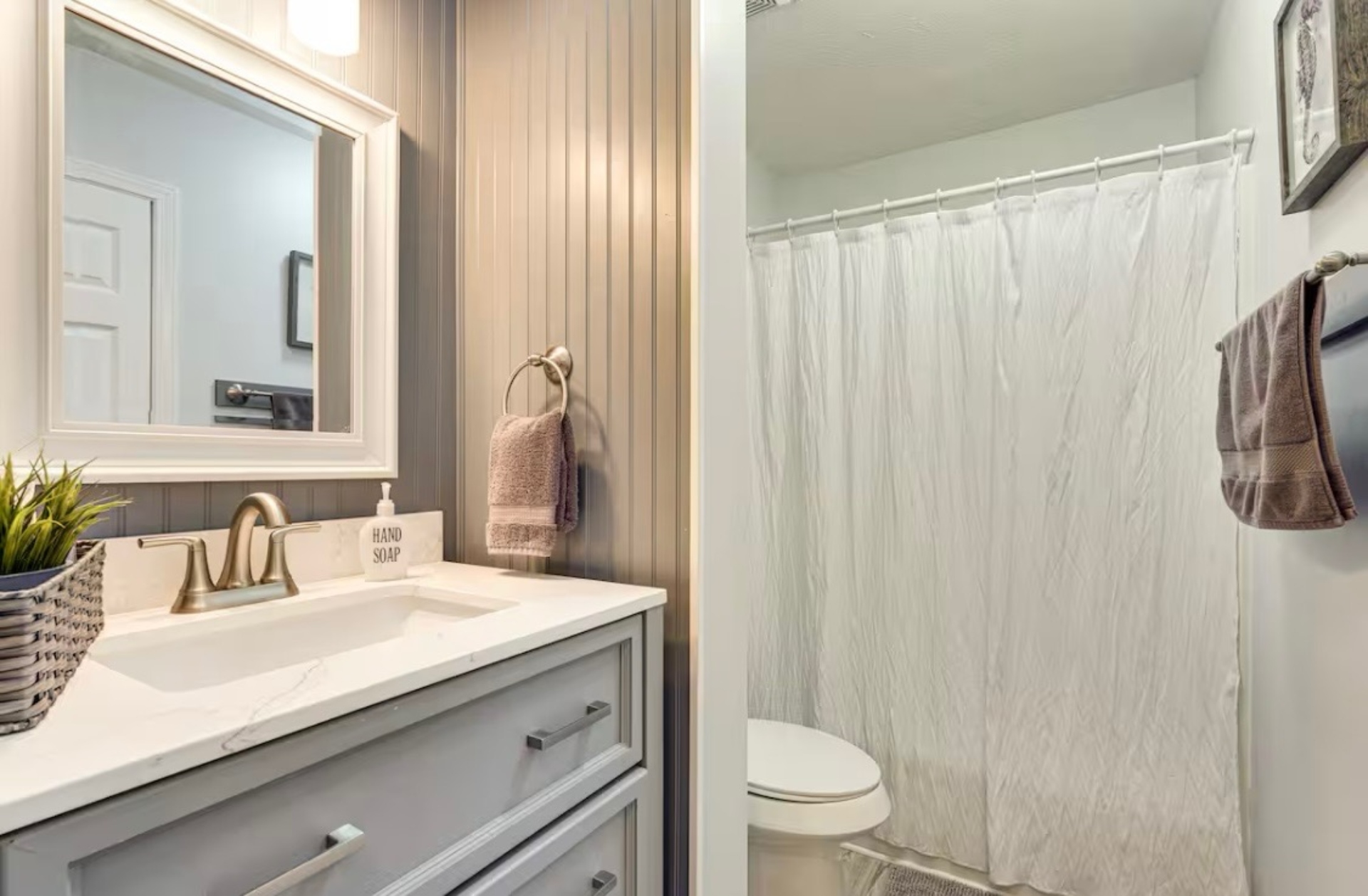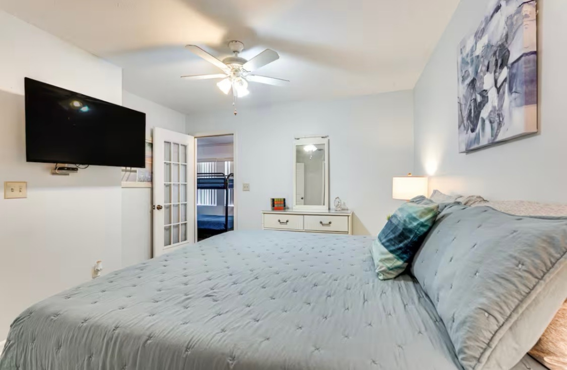 Upstairs, you'll find two bedrooms: both with king beds, smart TVs, and clothing storage. The full bathroom between them has a vanity and tub/shower combo.