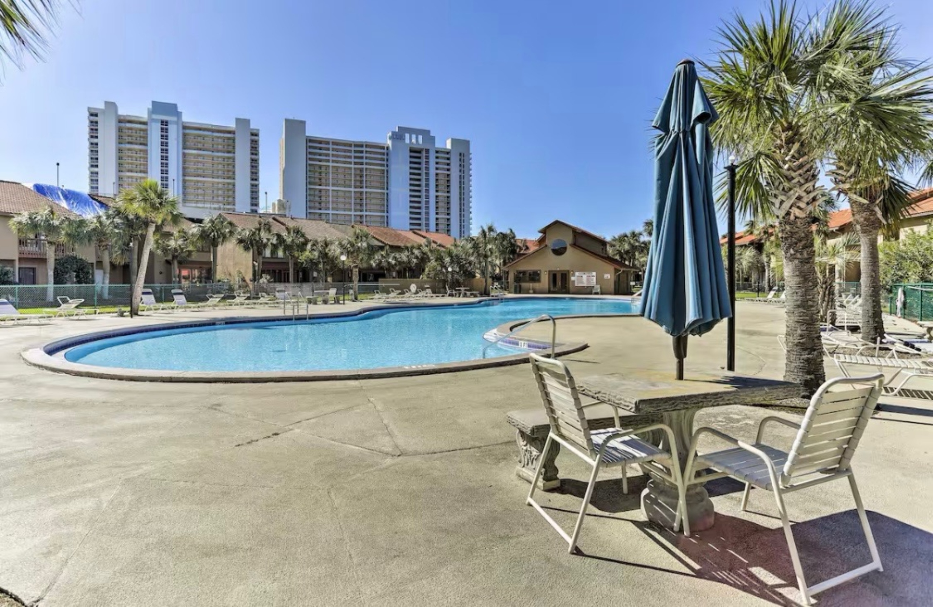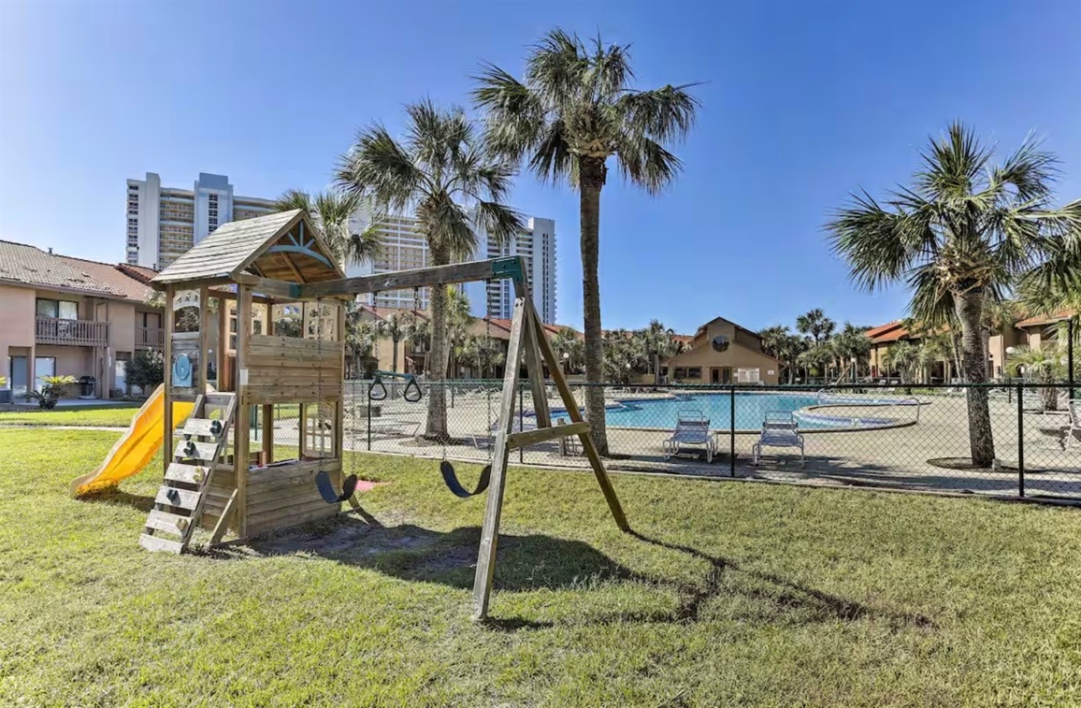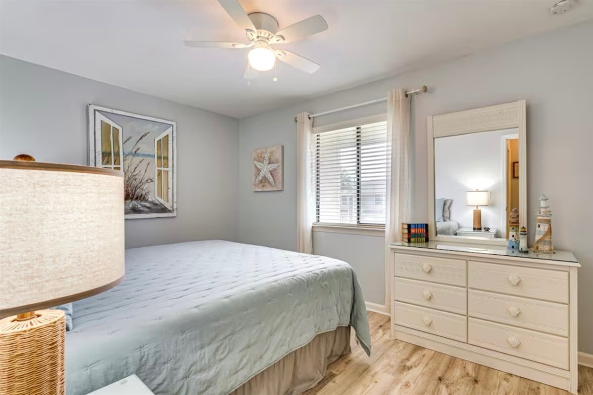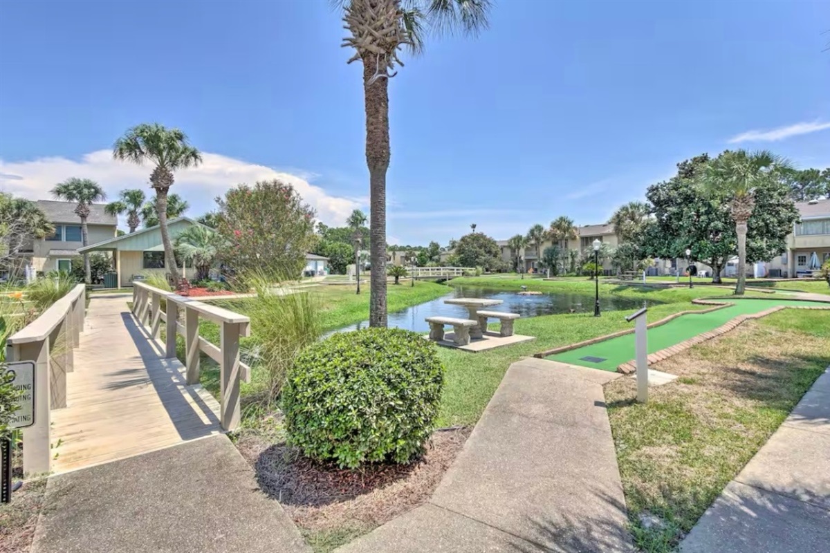 Out the back door, there is a patio with a table and benches with a great green space perfect for stretching little legs or for pups. Enjoy the nearby pool, putt-putt course, and shuffleboard courts, all within walking distance. The resort also features tennis courts and pickleball courts, just a short walk or golf cart ride away.